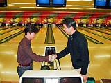 | 史上2度目のプレーオフは、最終戦と同日、時間をあらためて行われた。 第1ゲームはレーン状態の確認に手間取ったか、二人とも低調。 「このままのスコアなら優勝資格剥奪」などという冗談もギャラリーから飛び 出す始末だった。 しかしさすがはチャンピオン(候補)。第2ゲームで口羽が怒濤のストライク 攻勢をかけ、227(素点208)。一方の杉原は2ガーターなど未だレーンが 読み切れない。 第3ゲームも杉原は爆発できない。2フレをオープンし5フレ段階で78点 (+スペア分)。口羽は余裕でフィナーレへ向けて流している感じだ。 しかし第6フレでストライクを獲った杉原は、7フレでも幸運なストライクを 拾い、続けて8フレ9フレでもストライク。計算すると6フレ以降はストライク 以外は許されない状況だったのだ。 このあとも10フレの1投目もストライクは必須、2投目9本、3等目カバーで ようやく口羽を逆転するというプレッシャーのかかる状況。 しかし杉原は10フレ第1投をストライク、第2投もストライク、第3投もストラ イクとけっきょく6フレから7連続ストライクで239(素点238)を出し、驚異の 逆転勝利を収めた。 |